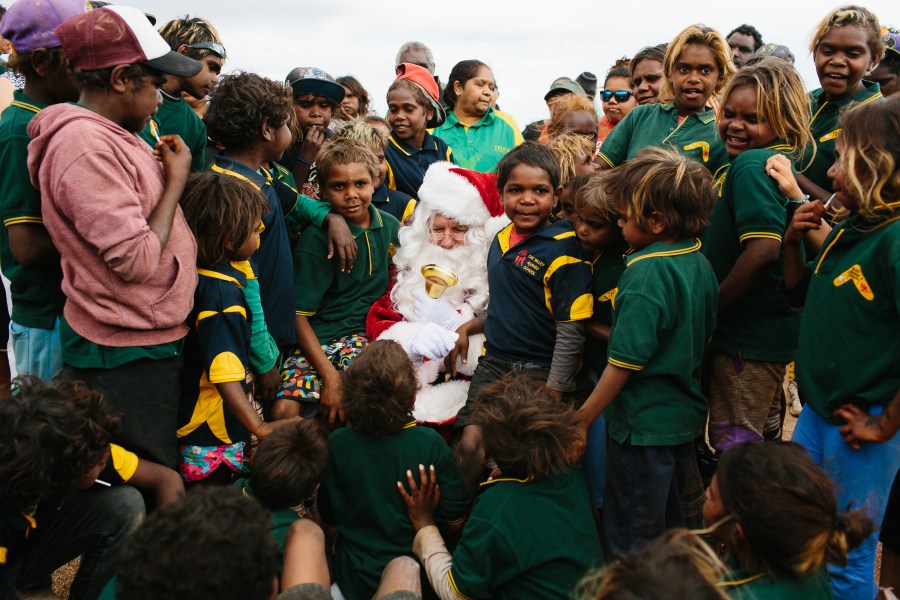 Santa seated in the desert surrounded by eager kids. Image Cameron Zegers Photography.